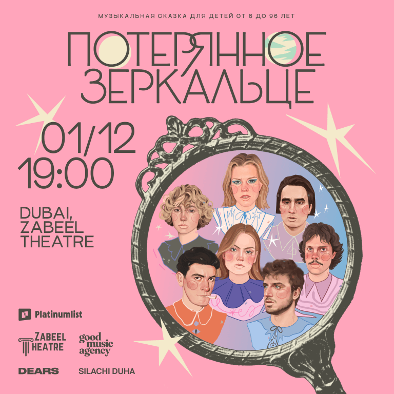 Lost Mirror / Потерянное зеркальце at Zabeel Theatre «Потерянное зеркальце» в театре Zabeel «Потерянное зеркальце» — это музыкальная постановка для взрослых и детей от 6 лет. В ней играют Александр Гудков, участники группы «Самое большое простое число» Евгения Борзых, Кирилл Иванов и Станислав Астахов, а также Марина Васильева, Доминик Мара и Серафима Гощанская. Действие на сцене происходит под музыку, которую специально для спектакля написала группа СПБЧ. «Потерянное зеркальце» создано по мотивам произведений писателя и художника Павла Пепперштейна. И всё действие спектакля развернется на фоне видеодекораций с его иллюстрациями. Костюмы для спектакля, сюрреалистичные и «очень буквальные», создавала команда из нескольких стран под руководством художников Марии Левиной и Полины Гречко. Ручное зеркальце с осколком звезды на рукоятке будет ускользать от воров, вести беседы с Трюмо и Русалкой-профессором, попадет в плен Птицы-ныряльщицы и вообще побывает в самых неожиданных местах. Конечно же, зеркальце волшебное: оно помогает своим хозяевам увидеть, как можно осуществить большие и, казалось бы, невозможные желания. За время своих странствий Зеркальце — и зрители тоже — узнает новое о себе и окружающем мире: о существовании шоколадного зоопарка, сосисочного ридикюля, котят-садовников и многого другого. И главную истину: необязательно быть волшебным, чтобы с тобой случилось что-то волшебное. Музыкальный спектакль “Потерянное зеркальце” at Zabeel Theatre at Zabeel Theatre, Jumeirah Zabeel Saray Hotel, Dubai, United Arab Emirates events Shows and Theatrical Plays Zabeel Theatre – Jumeirah Zabeel Saray