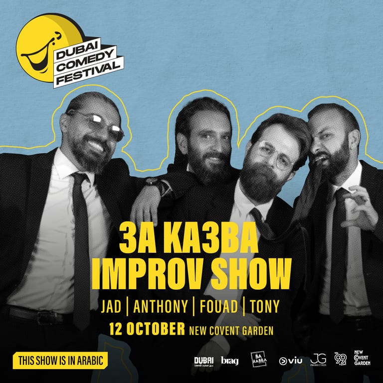 – Prepare for a night of quick wit, sharp humor, and spontaneous fun! The 3a Ka3ba Improv Show, featuring the incredible talents of Jad, Anthony, Fouad, and Tony, is set to light up the stage on the 12th of October at New Covent Garden as part of the Dubai Comedy Festival. With no scripts and plenty of surprises, this dynamic group delivers high-energy improv comedy that keeps audiences laughing from start to finish. Every show is completely unique, fueled by audience interaction and unpredictable moments. Don’t miss this one-of-a-kind comedy experience—secure your tickets now! 3a Ka3ba Improv Show Live at Dubai Comedy Festival at Ground level Entrance, no 1 Sheikh Zayed Rd, near ADCB Branch, Al Barsha, Al Barsha 1, Dubai, United Arab Emirates events Dubai Comedy Festival The New Covent Garden Theatre, Mall of the Emirates 3a Ka3ba
